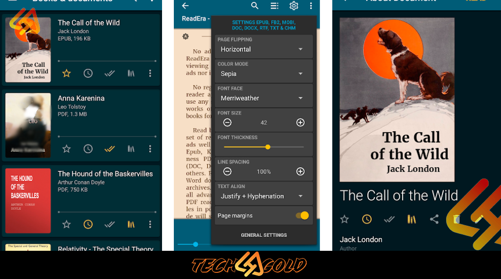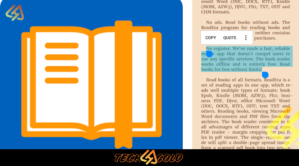 - دعم عدة صيغ: يدعم التطبيق ملفات PDF وEPUB وMOBI وDOC وTXT وRTF وFB2، وبالتالي يمكنك قراءة الملفات المختلفه دون ان تستخدم تطبيق خارجي اخر.